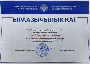 Бул жеңиш – мээнеттин,сабырдын жана ынтымактын жемиши. Колдоп келген бардык кесиптештерибизге жана ата-энелерге чексиз ыраазычылык билдиребиз! Алдыда дагы чоң ийгиликтер бизди күтөрүнө ишенебиз! Даярдаган мугалимдер: Саитова Саткынай Кульпудиновна. Масадикова Гулнара Муртазаевна.